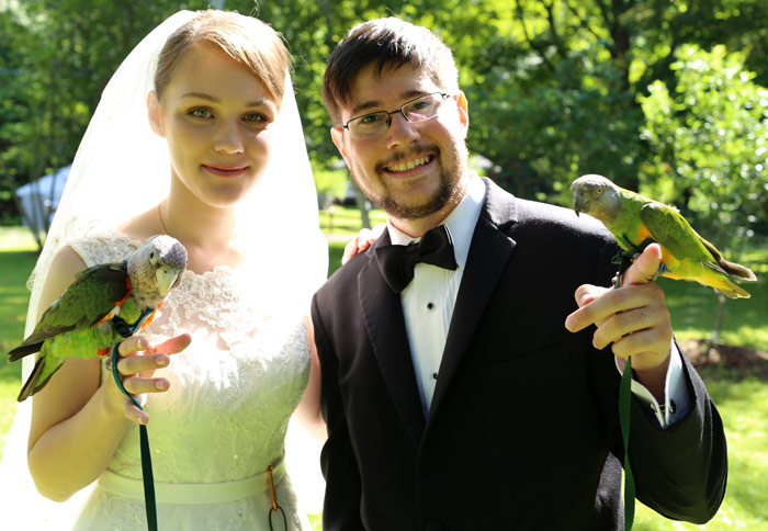 The other thing we had come to realize was that Santina's condition has been taking a toll on our bird and family life. Instead of focusing on making new training videos, taking the birds places, writing articles, and doing the sorts of bird things I usually do, I have been plagued with vet visits, quarantines, and depression. We could not travel with multiple birds, could not keep the birds together as a family, nor spend time with more than one bird at a time. The wedding was a distraction and kept us busy. We had to jump through hoops to make arrangements to get the birds involved in the wedding without impacting their quarantine.